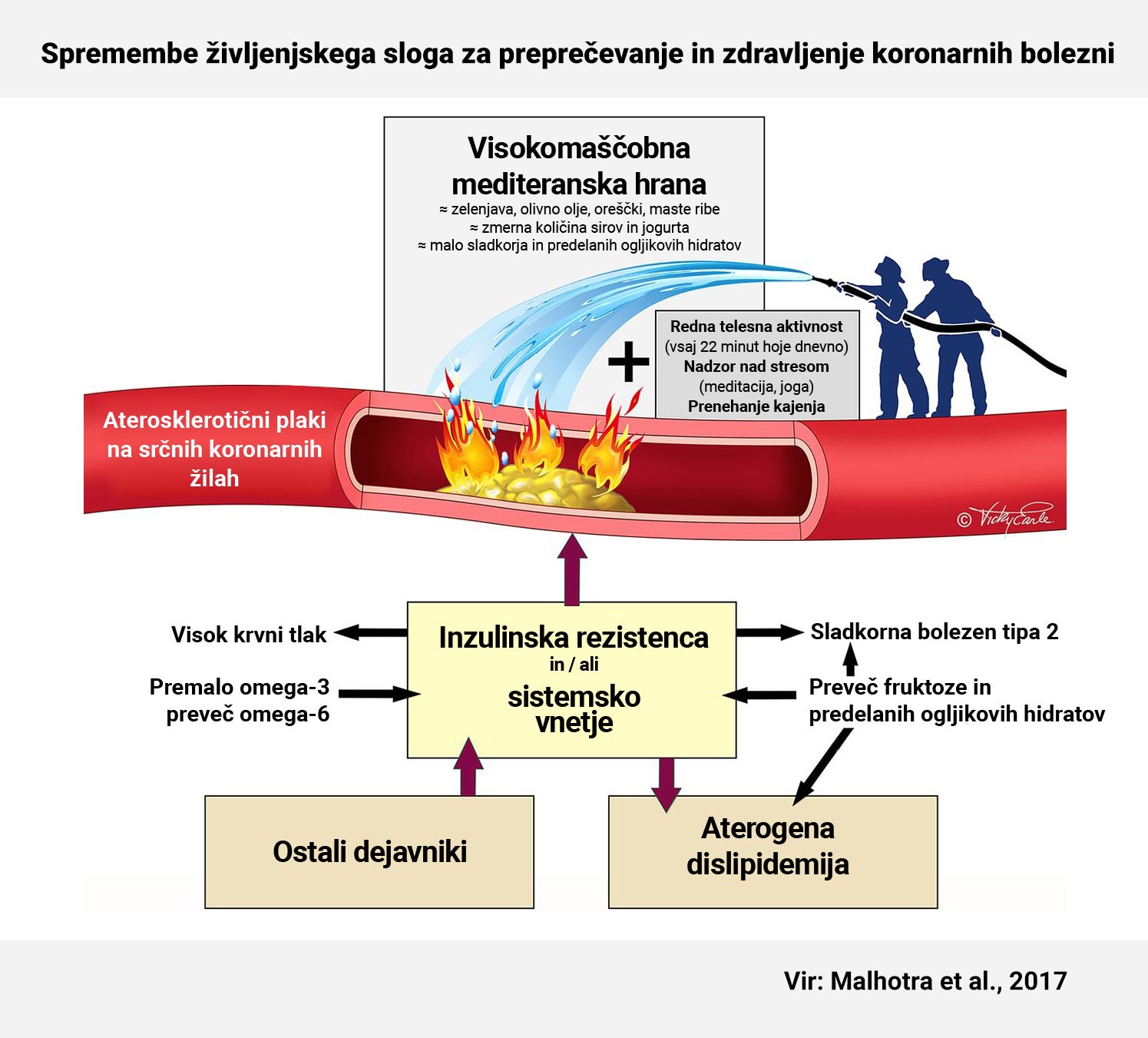 Patogeneza koronarnih bolezni oziroma ishemičnih bolezni srca nujno rabi novo razumevanje. Čeprav med medicinskimi profesionalci in tudi v javnosti vlada koncept, ki pravi, da maščobe iz hrane mašijo žile – tudi koronarne, je ta razlaga povsem napačna. Niti ugledni sistematični pregledi literature niti meta-analize opazovalnih študij niso pokazale vzročne povezave med uživanjem nasičenih maščob in smrtnostjo, koronarnimi boleznimi, smrtnostjo zaradi koronarnih bolezni, nenadno ishemično srčno smrtjo ali sladkorno boleznijo tipa 2. Prav tako ni nobene povezave med omejevanjem maščob v prehrani bolnikov in miokardnim infarktom, smrtnostjo zaradi srčno-žilnih bolezni ali smrtnostjo na splošno. Zelo zgovoren je rezultat raziskave, v kateri so z angiografijo ugotavljali pojavnost aterosklerotičnih plakov pri ženskah v obdobju po menopavzi: uživanje nasičenih maščob je bilo obratno povezano s plaki, medtem ko se je pokazalo, da imajo več plakov ženske, ki so uživale veliko ogljikovih hidratov in večkrat nenasičenih maščob.